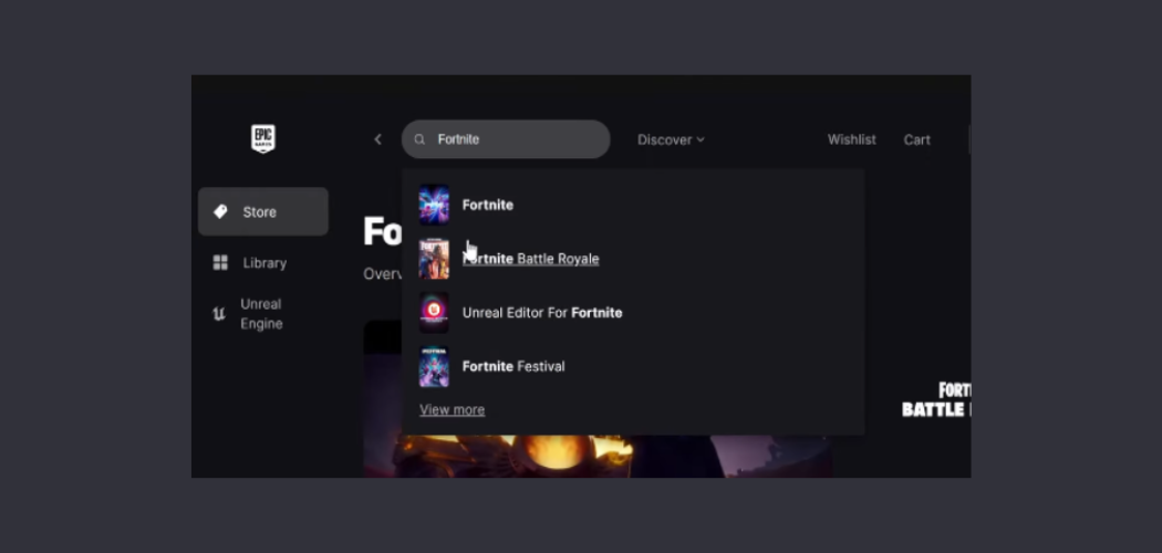 3️⃣ قم بتحميل اللعبة: افتح المتجر الخاص بمشغل إيبك قيمز واكتب "Fortnite" في خانة البحث ثم قم بتحميل اللعبة عن طريق الزر الموجود على جنب.
